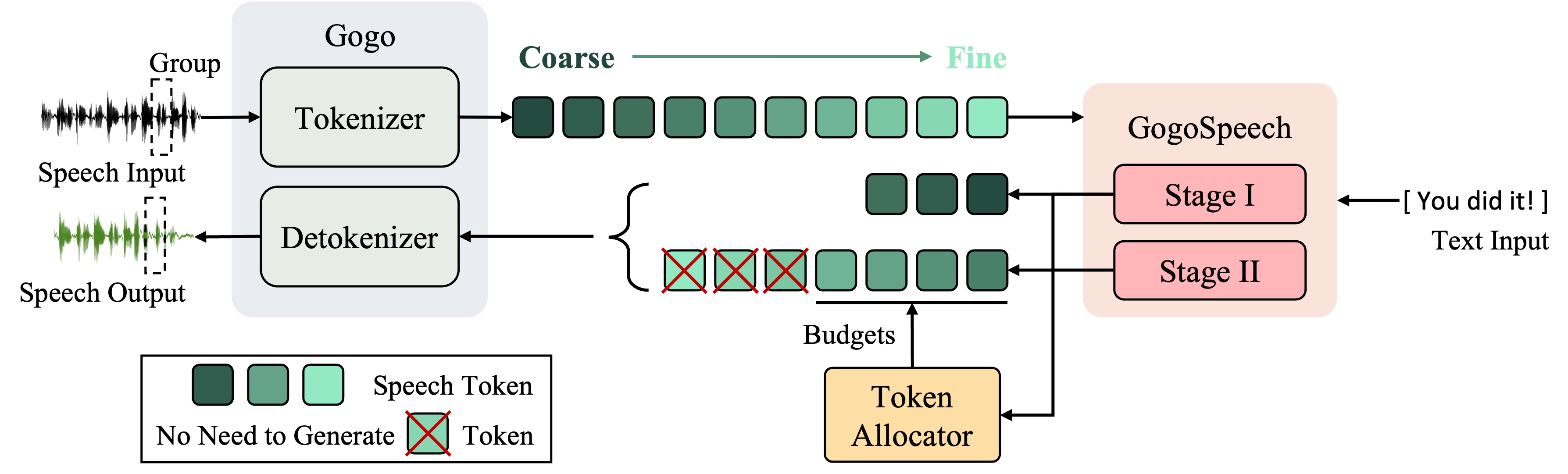 Abstract. Current speech language models require their core component, the speech codec, to discretize continuous speech signals into tokens that not only capture high-level cues for autoregressive modeling but also preserve sufficient acoustic details for perceptual quality. To address this need, we propose Gogo, a group-wise granularity-ordered codec that quantizes each group of frames into tokens arranged from coarse to fine, where coarse tokens encode high-level abstractions and fine tokens progressively recover low-level details. Building on the granularity-ordering property of Gogo, we introduce GogoSpeech, a two-stage speech language model that performs speech generation by first constructing a coarse speech backbone at an extremely low token rate and then enriching the backbone with fine-grained acoustic details. Considering the inherently non-uniform information distribution in speech signals, we further design a Group Relative Policy Optimization (GRPO)-trained token allocator that adaptively allocates token budgets to groups based on group-wise complexity. Experimental results demonstrate that Gogo delivers state-of-the-art reconstruction performance across most metrics at a token rate of 47. Moreover, evaluations on zero-shot text-to-speech tasks show that GogoSpeech enables efficient generation by adaptively reducing the average token rate, and attains state-of-the-art results in long-form speech generation.